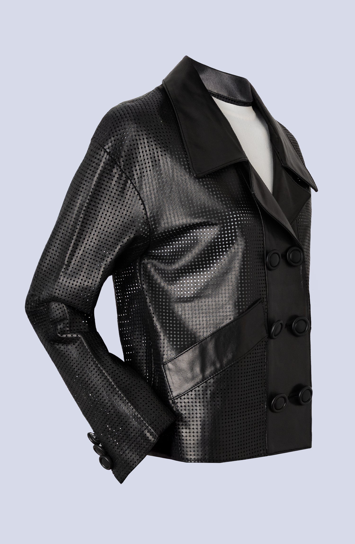 Crafted with precision, this perforated leather double-breasted jacket combines luxury with breathability. The perforated design enhances ventilation, making it ideal for sophisticated layering without compromising comfort. Its structured silhouette and double-breasted front deliver timeless elegance and a sharp, confident look, perfect for both professional and upscale casual settings.